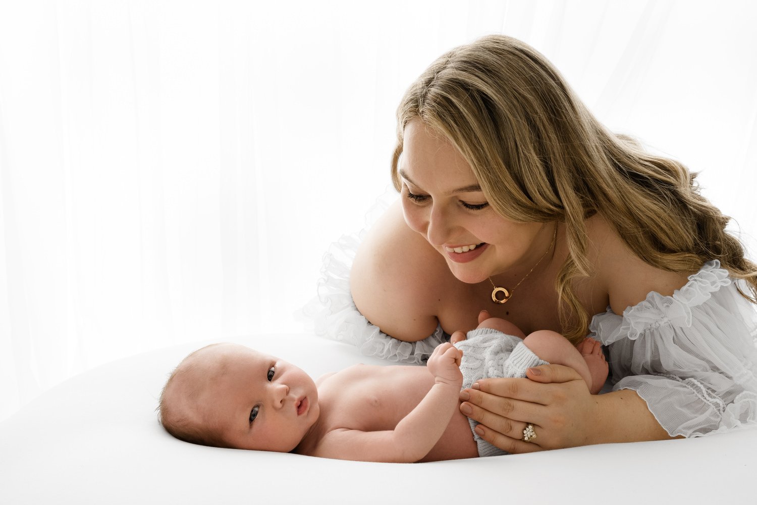 There are a few simple things you can do before your baby arrives to make the session easier. Treat yourself to a manicure with a neutral polish, and choose nude underwear so it doesn’t show through your outfit. I have an ever-growing studio wardrobe full of white and neutral clothes that work beautifully for photography, in all sizes. Of course, you’re welcome to bring your own white outfits too.